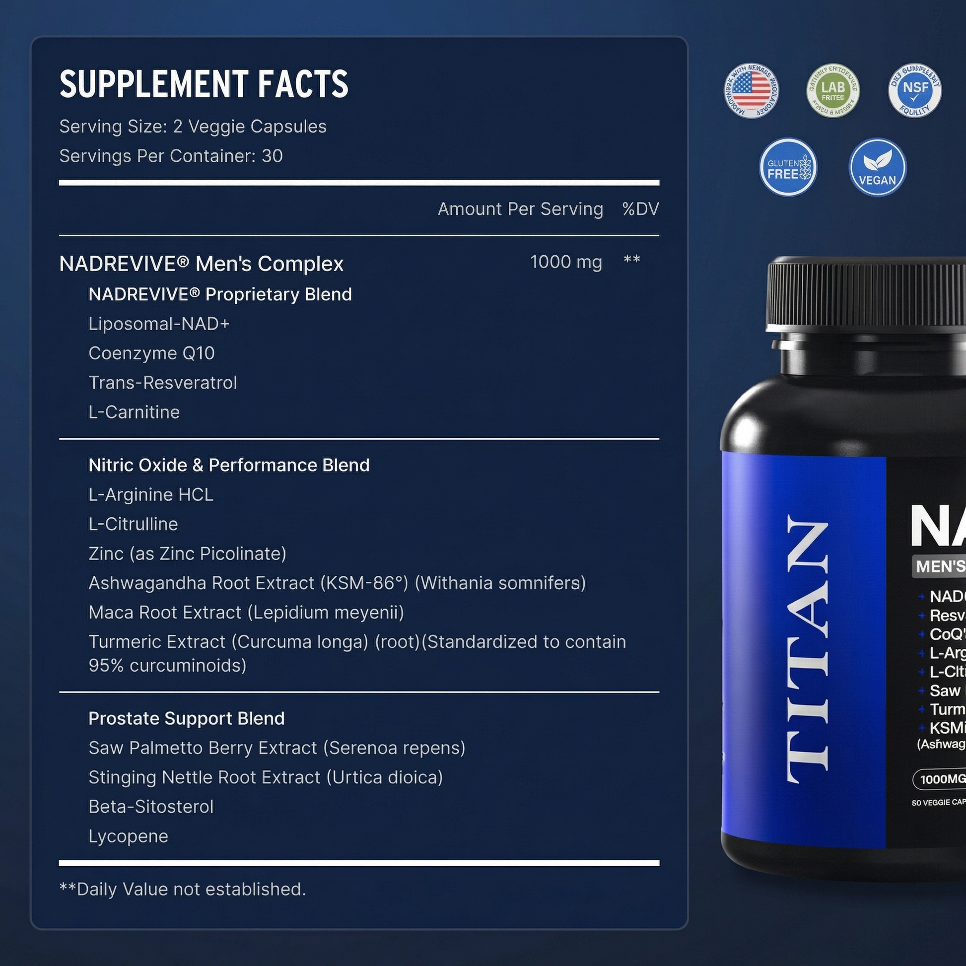 Titan NAD+ delivers a science-driven formula designed to support the core systems behind male performance — including cellular energy, blood flow, and hormonal balance.