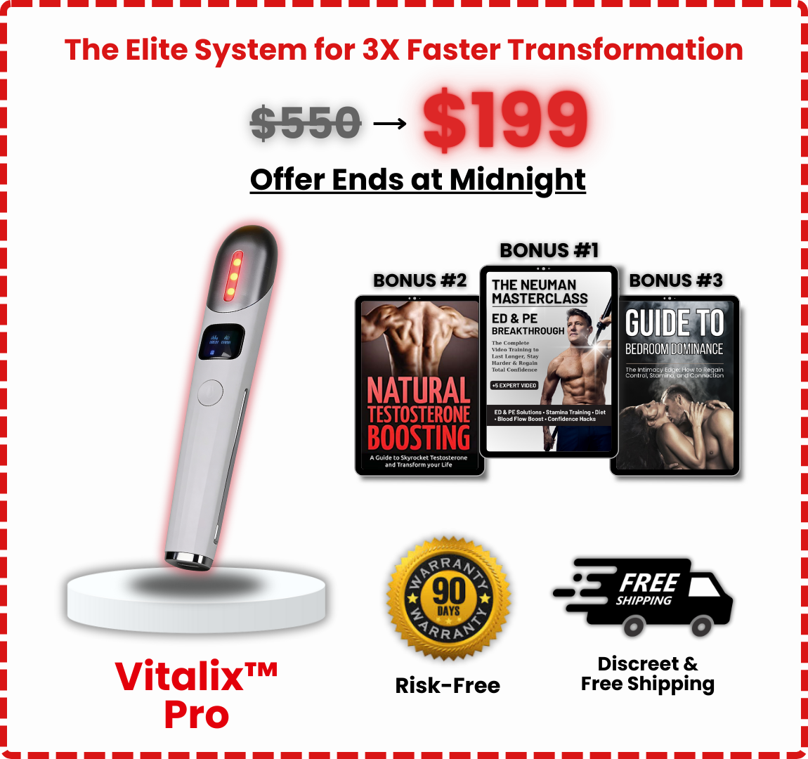 Our 90-Day Money-Back Guarantee means you can use VITALIX™ Pro for 3 full months. If you're not satisfied — email us, send it back, full refund. No questions asked. No "restocking fees." We take all the risk because we know it works.